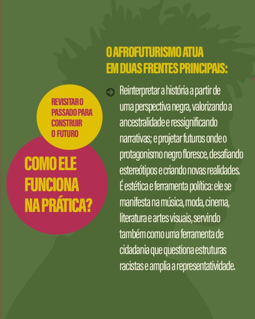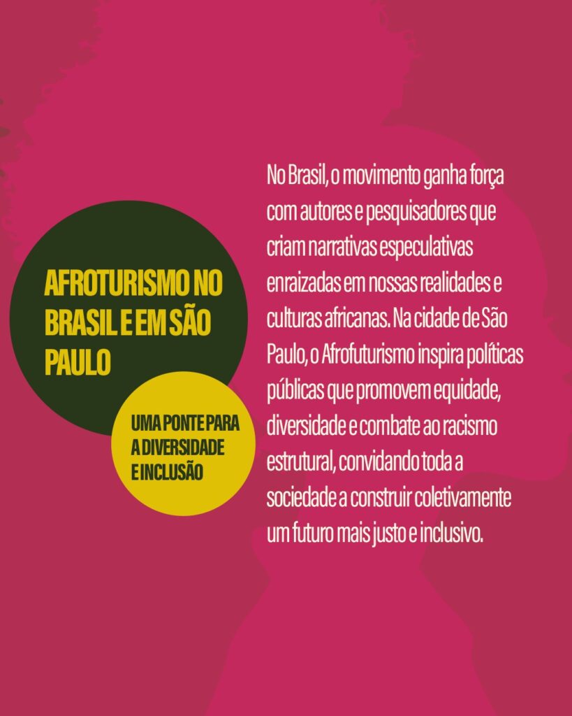 Por meio das Secretarias Municipais de Direitos Humanos e Cidadania (SMDHC), Relações Internacionais (SMRI), Educação (SME), Cultura (SMC), Desenvolvimento Econômico e Trabalho (SMDET), Saúde (SMS), Esporte e Lazer (SEME), Turismo (SMTUR), Governo (SGM), Assistência e Desenvolvimento Social (SMADS), Gestão (SEGES) e Subprefeituras (SMSUB), além de empresas públicas e autarquias, a Prefeitura de São Paulo estimula o debate e a reflexão sobre o conceito do Afrofuturismo, à luz do Programa São Paulo Farol Antirracista e das políticas públicas voltadas às comunidades indígenas, negras e imigrantes da cidade.